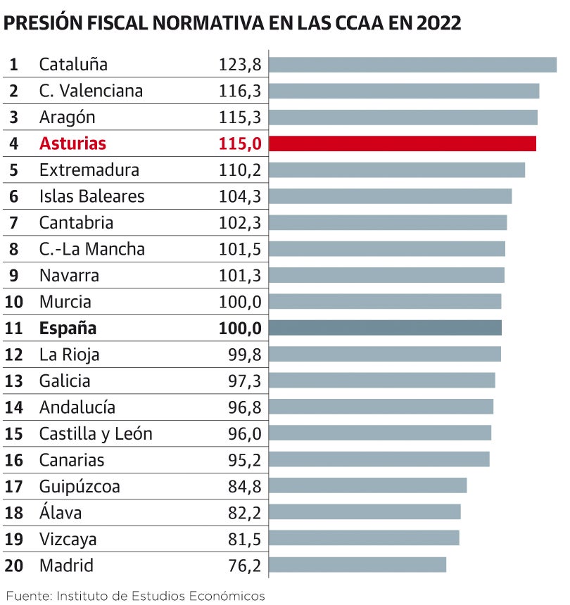 Y, según este criterio, la competitividad fiscal de Asturias, pero con carácter autonómico, suspende. Frente a la de sus ayuntamientos, la tributación dependiente del Principado obtiene de los peores resultados del país, con 115 puntos, tras Cataluña (123,8), Comunidad Valenciana (116,3) y Aragón (115,3) –el promedio sería 100–. Tiene en cuenta el IEE los análisis de la Fundación para el Avance de la Libertad y explica que, a pesar de esa posición, Asturias ha mejorado dos puestos en este registro en relación a 2020.