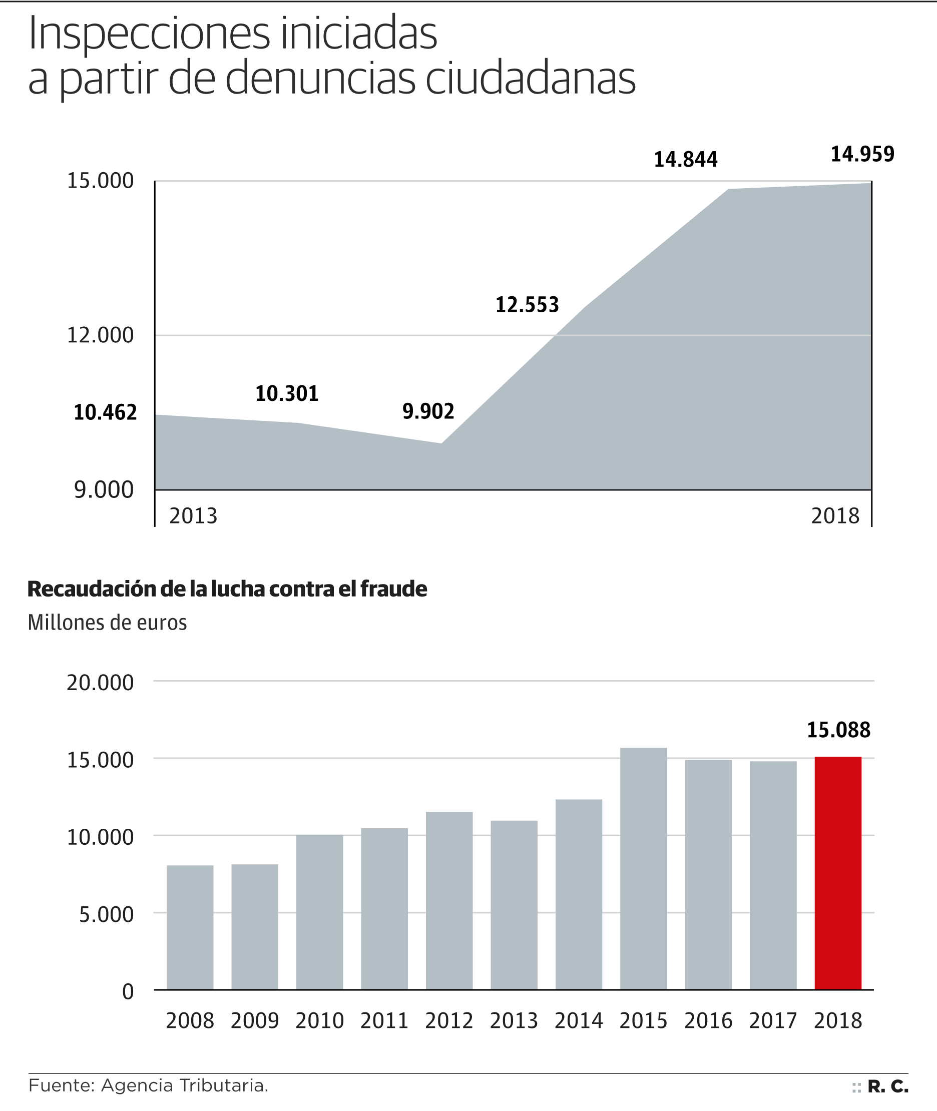 Entre el total de las actuaciones sobre grandes empresas, patrimonios y economía sumergida, 14.959 expedientes de inspección se llevaron a cabo a partir de denuncias de los ciudadanos, que dieron como resultado la recaudación de 140 millones de euros en 2018, una cifra que puede seguir aumentando en 2019 por la resolución de expedientes aún abiertos.