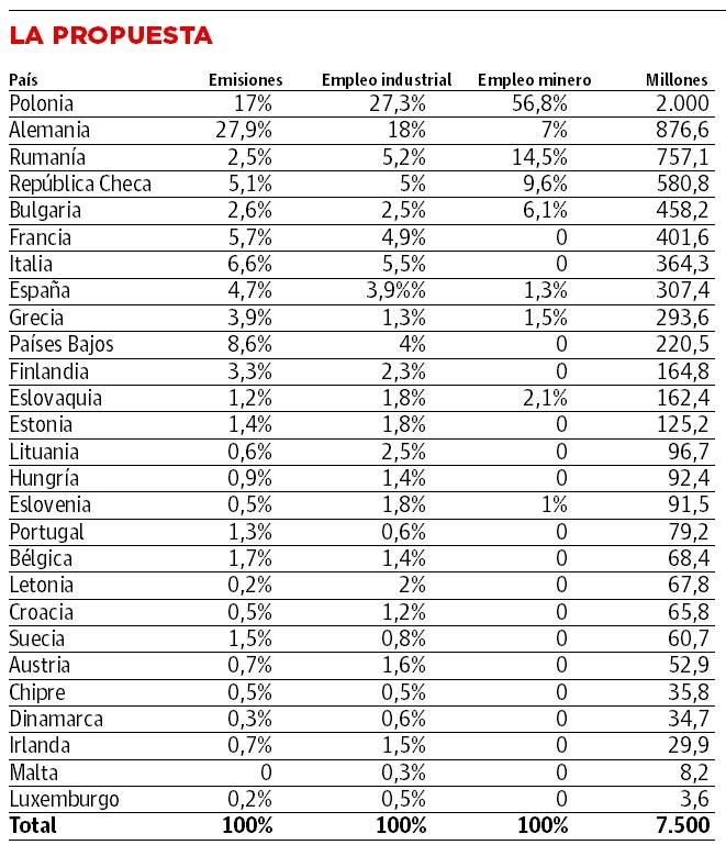 Los territorios afectados por el fin del carbón cerraron ayer filas para reclamar a la Comisión Europea un reparto de recursos económicos más justo. Hicieron suya la crítica de Teresa Ribera, vicepresidenta cuarta y ministra para la Transición Ecológica, quien el pasado jueves reconoció que los recursos previstos por el Pacto Verde eran insuficientes. Según la propuesta de Bruselas, España recibiría el 4% de los 7.500 millones de euros que integran el Fondo de Transición Justa, es decir, 307 (aunque podrían ampliarse hasta los 4.400 millones con las aportaciones de los países y las líneas de crédito).