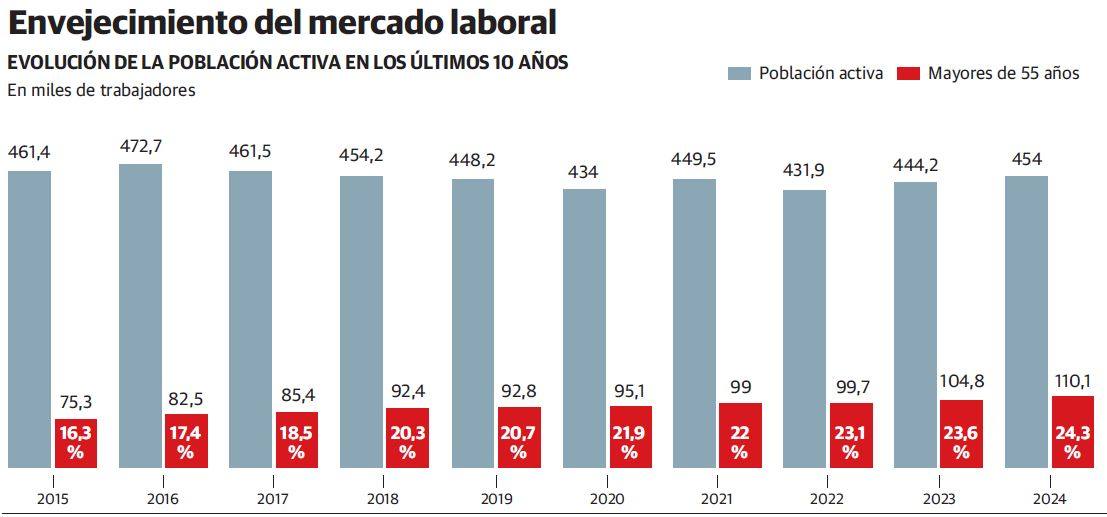 No hay relevo generacional para aquellos que se jubilan. Es una queja frecuente del sector empresarial que, lejos de ser abstracta, constatan los ... números. La sociedad envejece y, con ella, las personas ocupadas y las que engrosan las filas del paro. Se trata de un fenómeno generalizado de los países desarrollados, pero que en el caso del Principado es aún más intenso: casi uno de cada cuatro asturianos que trabaja o está en disposición de hacerlo tiene más de 55 años. Son 110.100, cerca de 36.000 más que los 74.300 de hace una década. En estos diez años han aumentado un 48% y en veinte, un 138,2%, ya que entonces apenas eran 46.400.