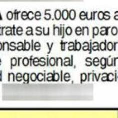 5.000 euros por contratar a su hijo. Eso es lo que ofrece un pensionista de 68 años, que ha publicado un anuncio por palabras en el periódico El Heraldo de Aragón para dar a conocer su oferta. Desde que publicó el anuncio en prensa, este juiblado afirma haber recibido veinte ofertas de empleo, según sostiene el diario El País.