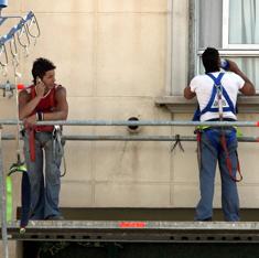 Dos trabajadores descansan en un andamio.