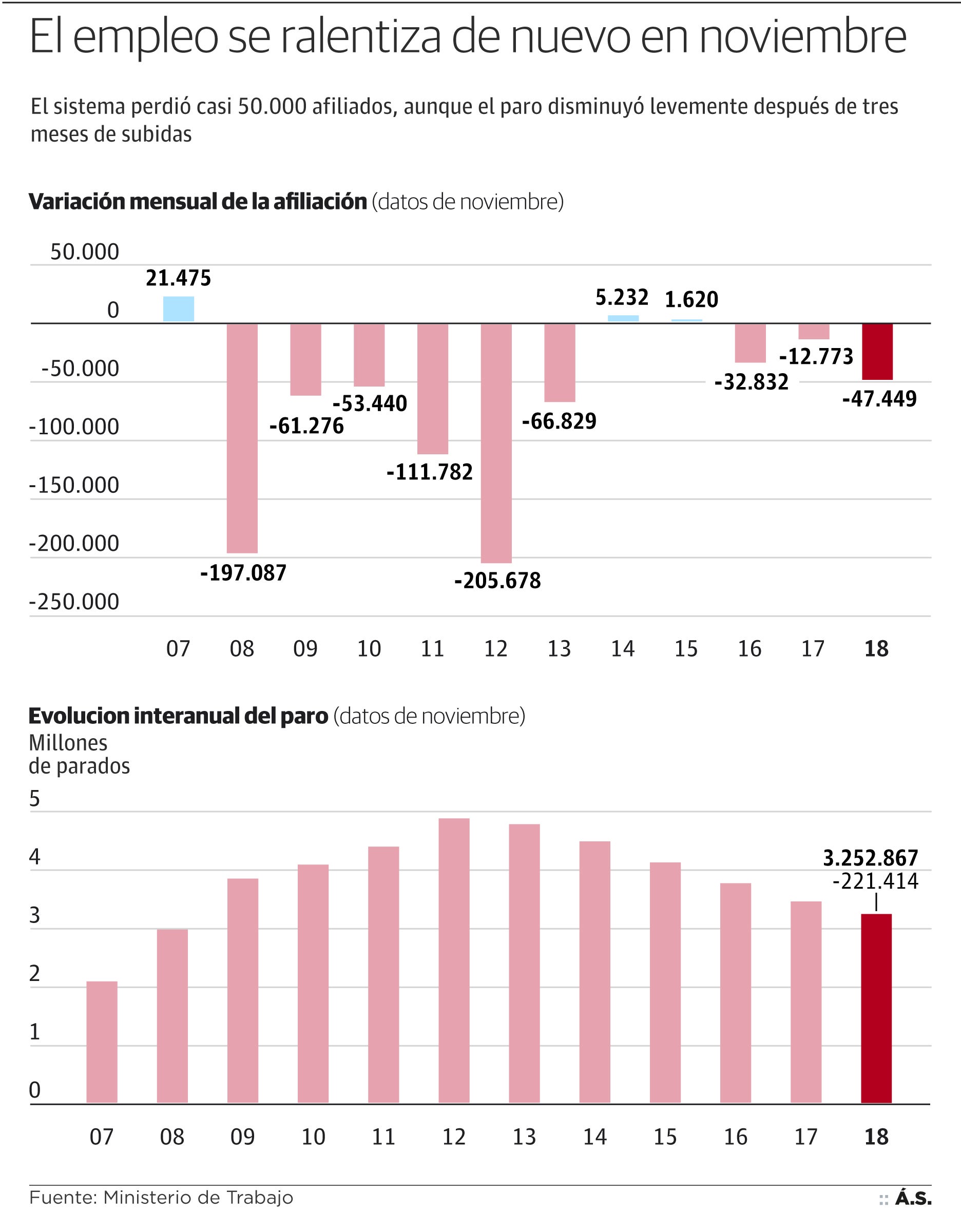 Se trata del peor noviembre desde 2013. En los dos años anteriores, la afiliación también bajó, aunque en menor cantidad (32.832 ocupados menos en 2016 y 12.773 menos en 2017), mientras que en 2015 y 2014 se registraron leves aumentos después de un periodo (2008-2013) de fuertes descensos. Así, el número total de afiliados se reduce hasta los 18.945.624, pese a que los últimos doce meses el sistema se ha incrementado con más de 527.000 trabajadores.