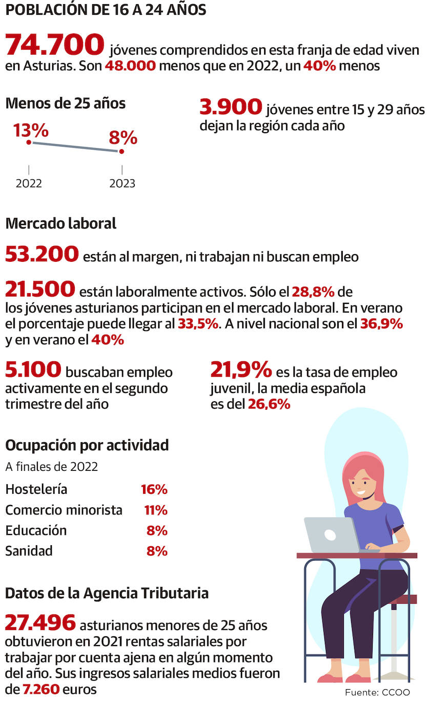 La situación mejora ligeramente en los últimos meses, pero el panorama de los jóvenes asturianos es poco menos que desolador. Desde 2002 la comunidad ha perdido 48.000 habitantes de entre 16 y 24 años, casi un 40%, por una evolución de la natalidad a la baja, pero también por un escenario profesional nada halagüeño. Entonces, trece de cada cien residentes en el Principado tenían menos de 25 años, ahora son ocho. En la actualidad hay alrededor de 74.700 asturianos en esa horquilla de edad y la mayoría ni trabaja ni busca empleo activamente, según los criterios que fija la Encuesta de Población Activa (EPA), que ayer CC OO desgranó en el informe 'Jóvenes en el mercado laboral asturiano'. Por lo tanto, ni siquiera tres de cada diez jóvenes asturianos (28,8%) participan de este mercado, son 21.500 frente a los 53.200 que están ajenos a él -siete de cada diez-, en buena medida mientras prosiguen sus estudios. Así, en verano, su participación aumenta, el pasado alcanzó el 33,5%, pero a nivel nacional son habitualmente el 36,9% y en julio y agosto llegan al 40%. «El menor dinamismo de la región podría explicar que los jóvenes asturianos se incorporen menos o más tarde a la búsqueda de trabajo», señala el documento elaborado por CC OO Asturias y que fue presentado ayer por Helena Plaza, responsable de Espacio Joven de Asturias, en la Fidma, que se lamentó de la precariedad a la que se enfrentan los jóvenes en su primer trabajo. «Nos cuesta más desarrollar nuestro proyecto de vida».