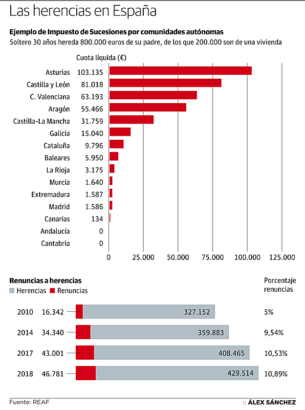 En su informe con el Registro de Economistas Asesores Fiscales (REAF) 'Panorama de la Fiscalidad Autonómica y Foral 2019' establecen una serie de ejemplos para cada comunidad dependiendo del grado de consanguinidad del heredero. En el caso de una persona que hereda de su padre 800.000 euros, de los que 200.000 corresponden a una vivienda, en algunas regiones no pagaría nada por Impuesto de Sucesiones, como en Andalucía o Cantabria, poco en otras como Canarias (solo 134 euros), mientras que en las que más tendría que aportar el heredero de ese patrimonio según el ejemplo propuesto sería en Castilla y León (81.000 euros) y Asturias (103.000 euros).