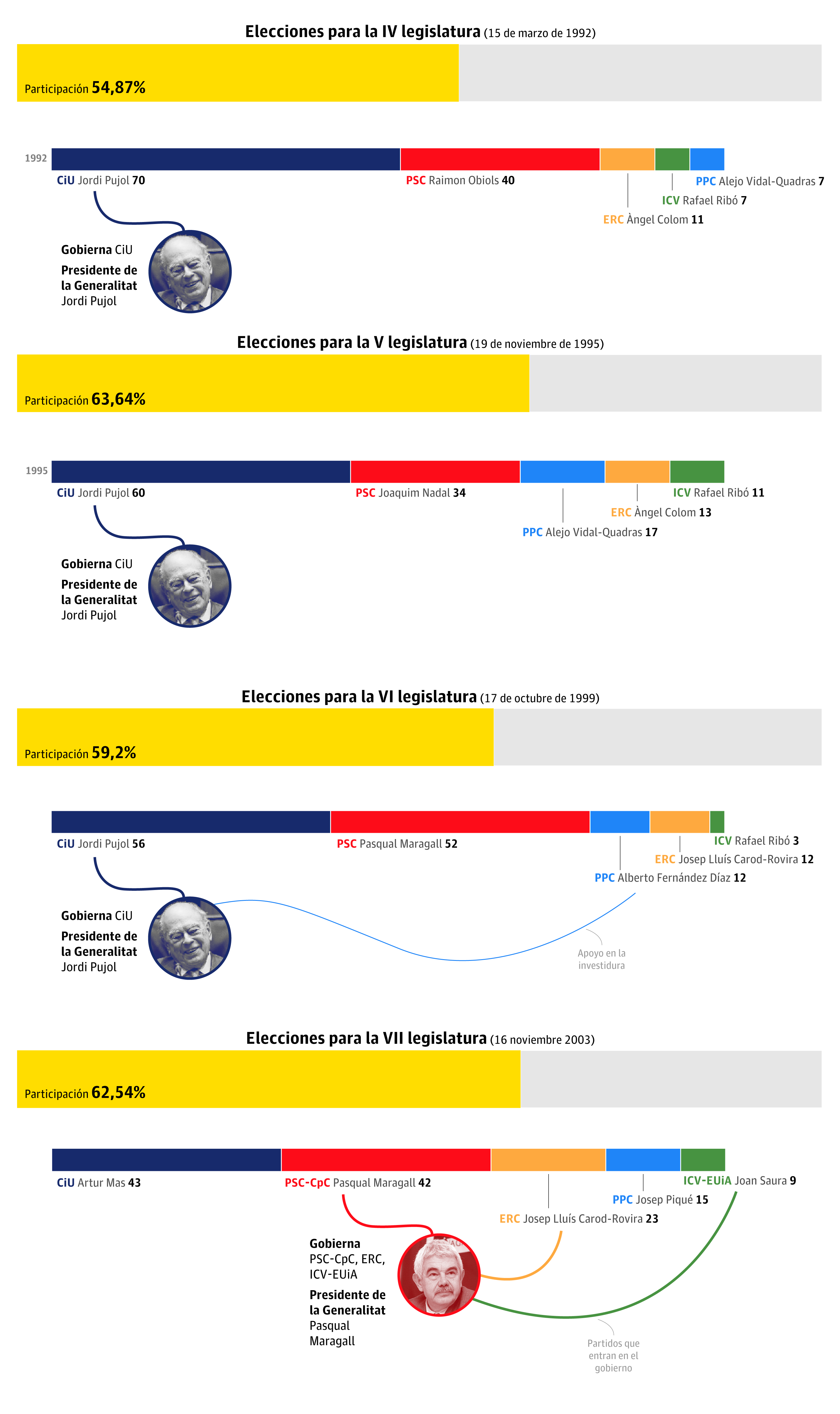 En 2003, en cambio, las tornas cambiaron para la política catalana y, aunque el socialista Pasqual Maragall no obtuvo el primer puesto, logró gobernar gracias al apoyo en la investidura de ERC e Iniciativa Per Catalunya. Aquel año la participación subió al 62,54%.