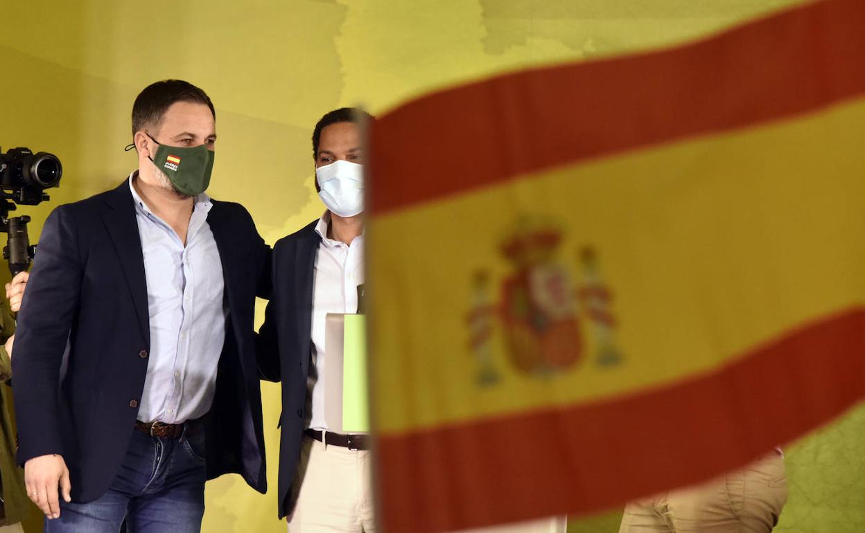Santiago Abascal y el candidato de Vox, Ignacio Garriga, se dirigen a avalorar los resultados electorales de su partido el domingo por la noche. E. P.