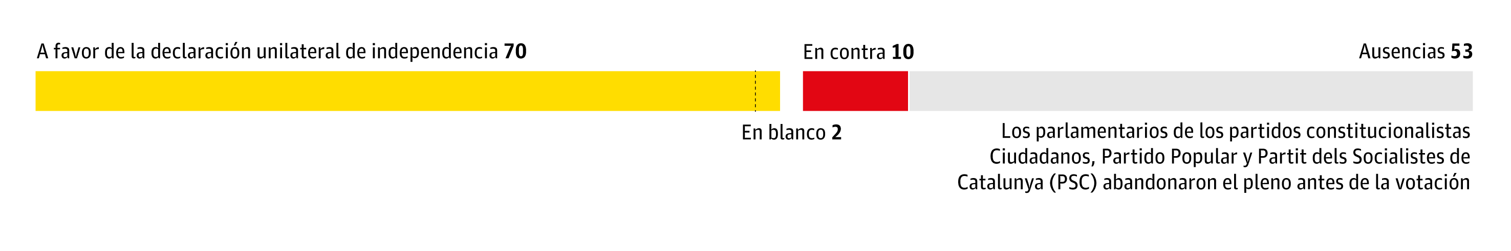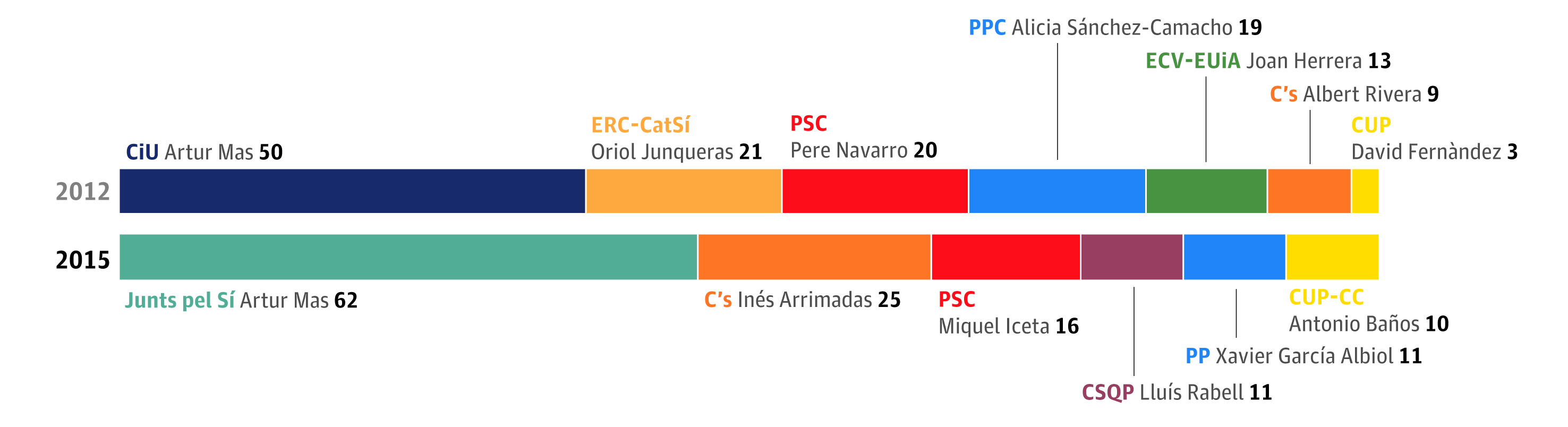 27 de septiembre de 2015: Junts pel Sí (una coalición secesionista integrada por CDC y ERC) obtiene 62 diputados y la CUP, 10. Mayoría absoluta en escaños, pero no en votos. Aun así, las dos formaciones prometen la independencia en 18 meses. El 'procés' se acelera.