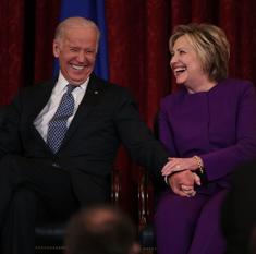 Joseph Biden (i) y Hillary Clinton ríen durante un debate.