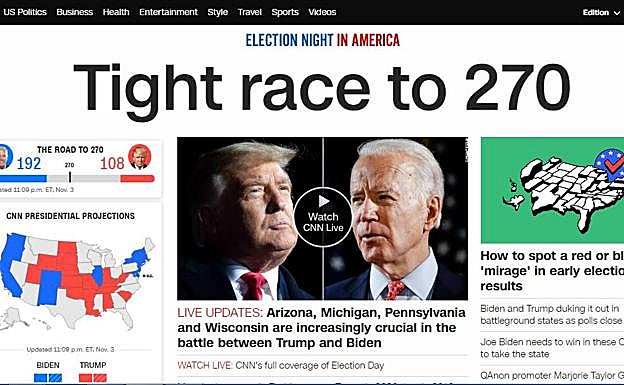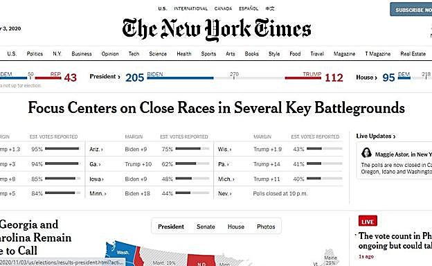 «Una participación histórica en las elecciones de Estados Unidos», titulaba esta madrugada el 'New York Times' en su página web. El tabloide ha actuado con cautela a la hora de interpretar los ajustados resultados electorales. De Joe Biden, apuntan que se ha adjudicado numerosas victorias previsibles en el noreste del país, mientras que Trump se ha mostrado fuerte en los Estados del sur.