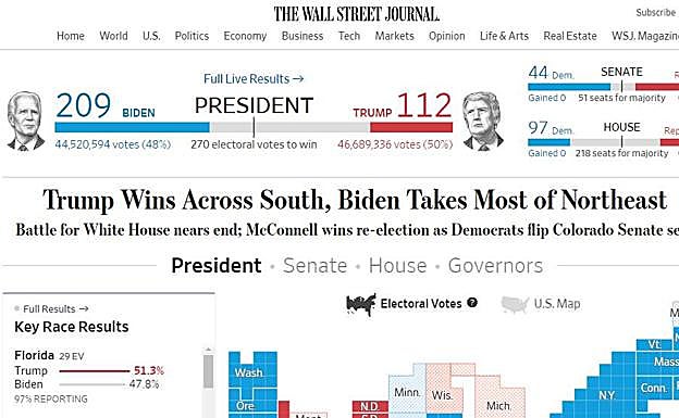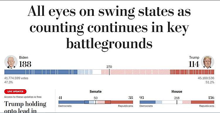 El 'Washigton Post' destacaba esta madrugada el triunfo de Trump en Florida y la «sorpresiva fuerza» de Biden en Ohio y Texas. «Los resultados podrían tomar más tiempo en algunos Estados debido al aumento del voto por correo», advertia el medio en un mensaje subrayado en amarillo. Los últimos pronósticos del periódico dan como ganador a Biden en Colorado y a Trump en Carolina del Sur. Mientras Trump se apoya en su triunfo en Florida, «el candidato demócrata se aferra a su ventaja en Arizona», señalaba el medio esta madrugada.