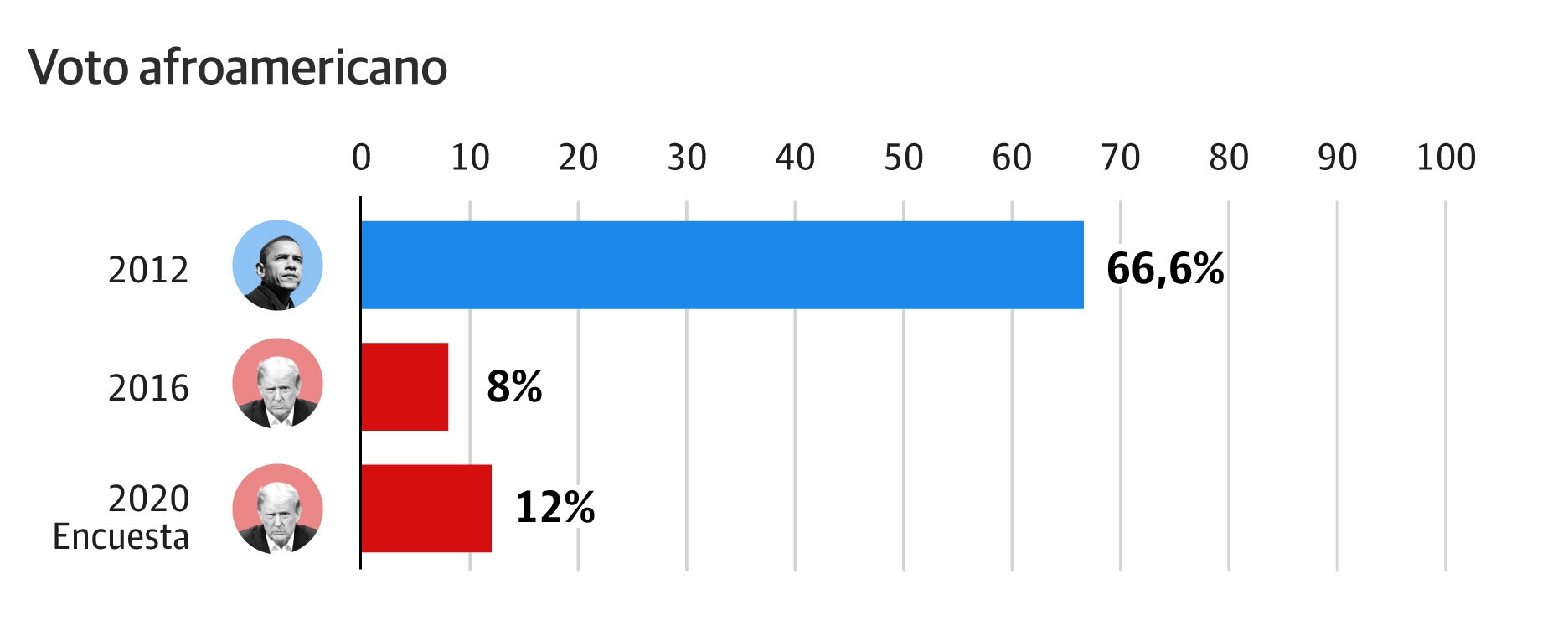Se buscará saber si la participación de los afroamericanos es tan alta como la que dio la victoria a Obama en 2012 (66.6%) y si Trump mejora sus resultados entre ellos. En 2016 sólo se llevó el 8% del voto afroamericano, pero una cuesta de Siena College para el New York Times le otorga esta vez un 12% gracias al voto evangélico, el apoyo de raperos como Ice Cube y el llamado «Plan Platinum» con el que promete poner a disposición de nuevos emprendedores afroamericanos 500.000 millones de dólares.