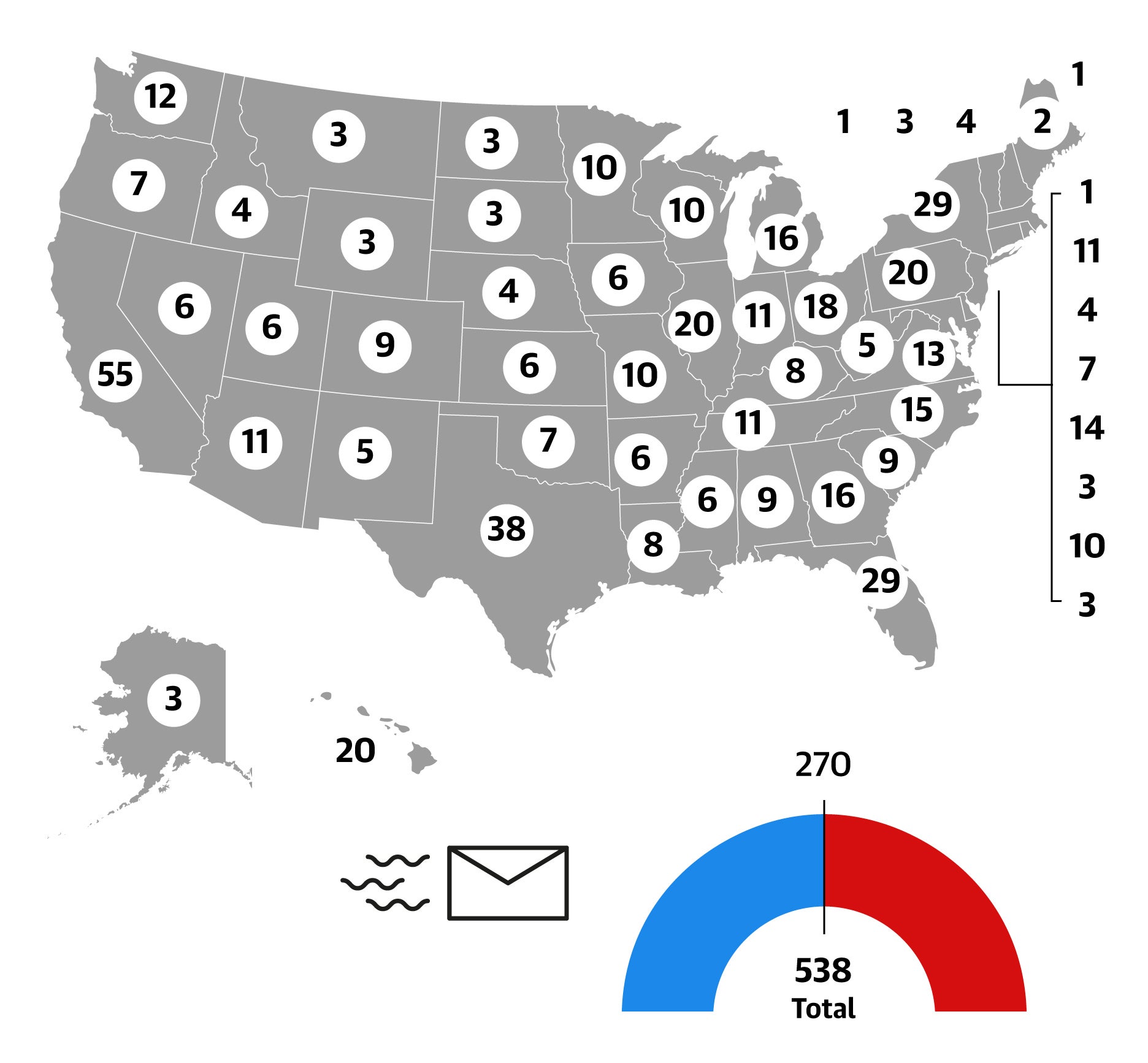 En EEUU no se vota directamente al presidente, sino a los 538 compromisarios del Colegio Electoral, adjudicados a cada estado según su representación en el Congreso. Salvo en Maine y Nebraska, el ganador se lo lleva todo, aunque solo tenga un voto más que su rival. De ahí que las encuestas nacionales en las que Biden no sean representativas y que el resultado pueda dar un vuelco fácilmente dependiendo de en qué casilla caigan los principales estados. El primer candidato que obtenga 270 compromisarios gana las elecciones.