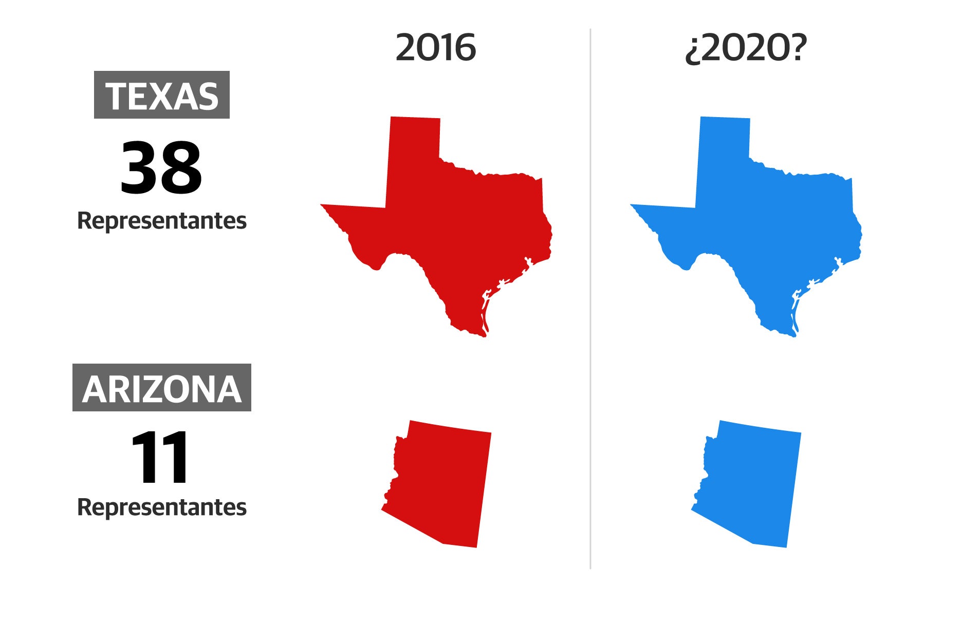 El mayor notición de la noche sería que Texas votase demócrata por primera vez en décadas y si lo hiciera se lo debería a la emigración llegada de California y la población de origen hispano. El segundo estado más poblado del país ofrece 38 representantes del Colegio Electoral, más incluso que Florida, por lo que pondría a Biden en cabeza, pero no a Trump, que ya cuenta con ello. Sin embargo, es más probable que la sorpresa la de Arizona donde ambos candidatos han dedicado muchos recursos. Trump lo ganó por apenas un 3.5% en 2016, por lo que se asume que si Biden se lo lleva esta vez también ganará Nevada, que ya cayó entonces en manos de Hillary Clinton. Juntos ofrecen 17 votos, así que Biden todavía tendría que seguir coleccionando victorias de estados bisagra en el resto del país.