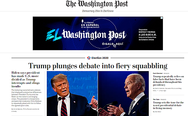 Estados Unidos estaba preparado para contemplar un combate de boxeo en el debate presidencial entre Donald Trump y Joe Biden, pero no una pelea clandestina en el club de la lucha. «Caótico», ha sentenciado esta madrugada 'The New York Times' en alusión al cara a cara entre los dos aspirantes. «Turbulento», ha coincidido 'The Washington Post' mientras 'The Guardian' destacaba el «amargo enfrentamiento personal» entre el líder republicano y el demócrata.