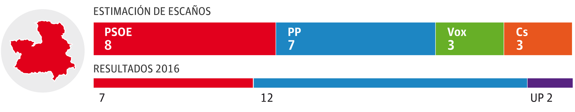 El PSOE ganaría con claridad y obtendría entre dos y tres escaños, por delante de una coalición de PP y Foro que se movería entre uno y dos y del resto de formaciones en liza, que lograrían un parlamentario cada una: Ciudadanos, Podemos y Vox. La encuesta pronostica que un escaño 'baila' entre el PSOE y PP-Foro. En porcentaje, los socialistas superan en once puntos a la coalición de la derecha.