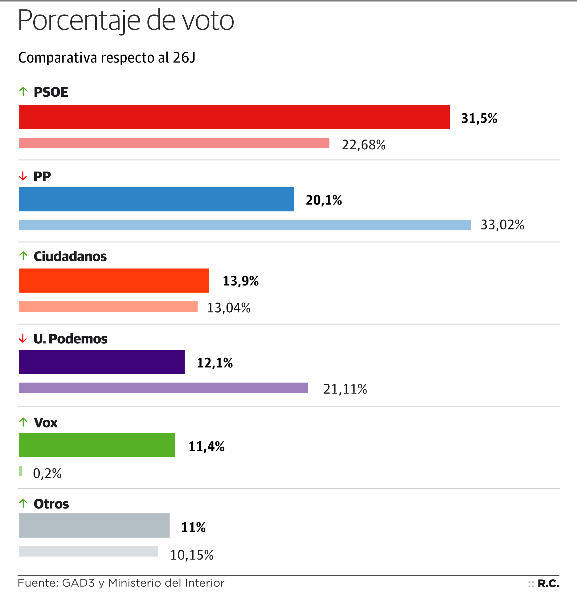 Los socialistas de Pedro Sánchez obtendrán, de acuerdo al sondeo, un resultado similar al que obtuvo Mariano Rajoy el 26 de junio de 2016. Cosecharán entre 134 y 139 diputados, y superarán los escaños de PP y Ciudadanos juntos, que sumarán entre 123 y 130. Pero a pesar de esta victoria, Pedro Sánchez no tiene garantizado gobernar porque su aliado natural, Unidas Podemos, sigue hundido en el pozo de los 27 escaños, los mismos que en el sondeo de GAD3 de hace un mes.