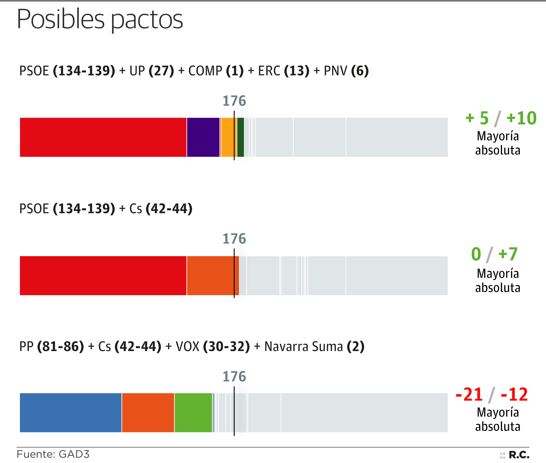 El PSOE ganaría con comodidad, según la encuesta de GAD3 para este periódico, y la derecha, pese a que logra más votos, sigue lejos de los 176 escaños de la mayoría absoluta
