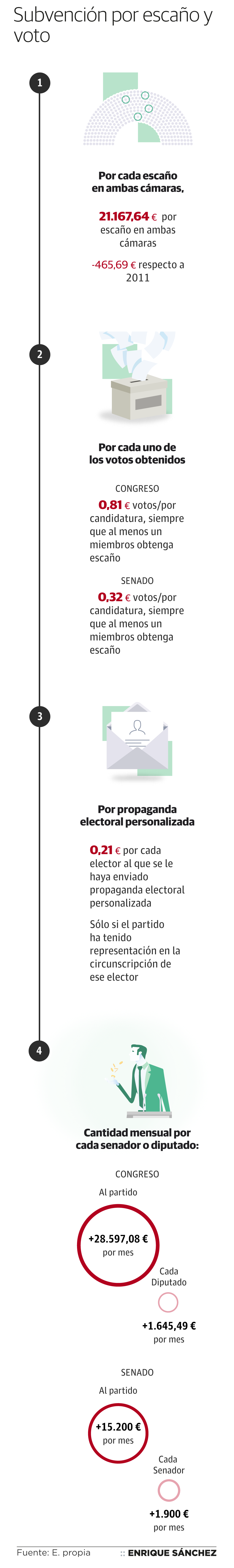 Los partidos políticos reciben subvenciones por cada diputado o senador que obtienen en las elecciones, pero también por los votos que reciben y hasta por el envío de propaganda