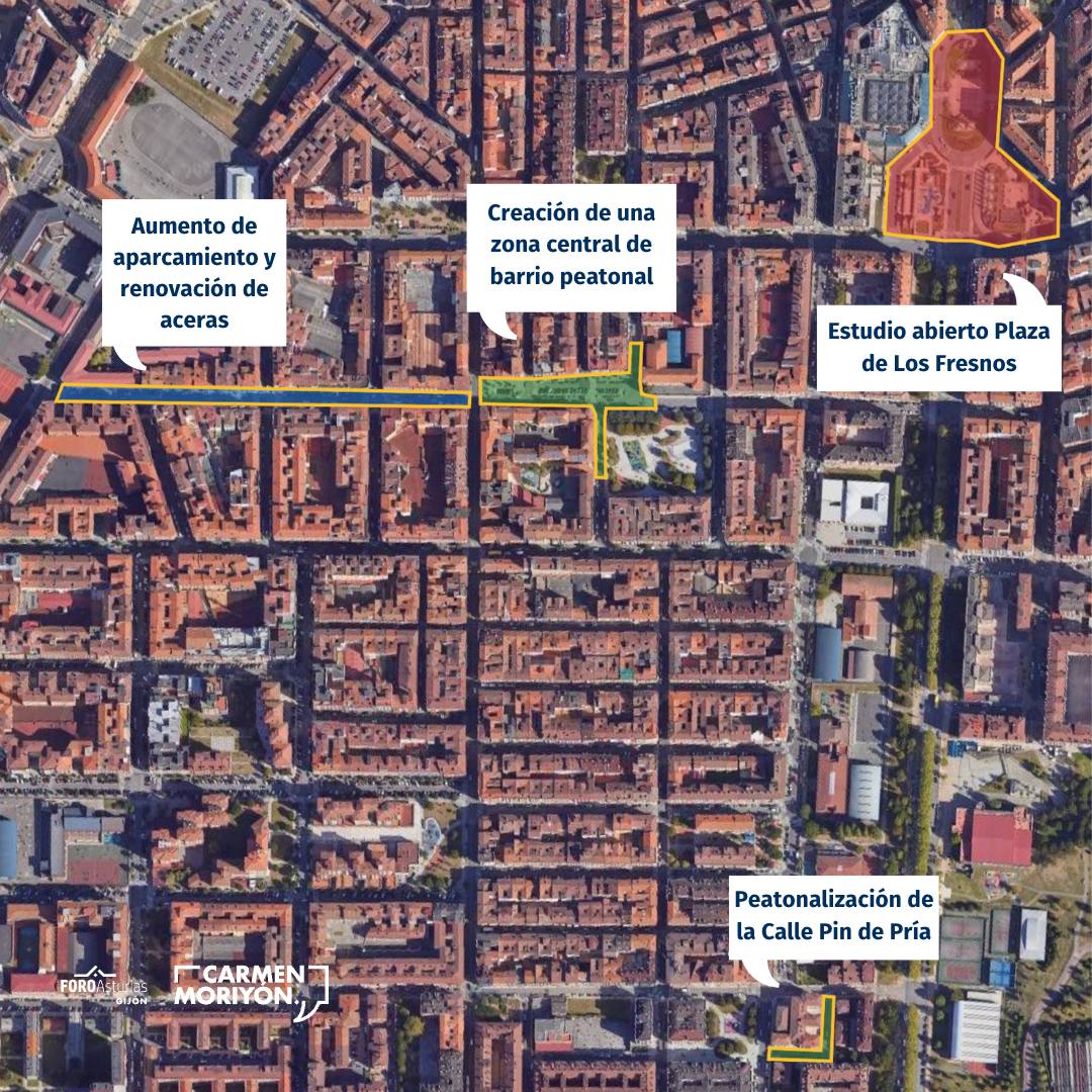 Otra de las actuaciones que prometen es la peatonalización de la calle Pin de Pría como resultado de la prolongación de la calle Pablo Olavide. Y, por último, la creación de zonas estanciales a lo largo de la avenida de Schulz, espacios para el aprovechamiento de peatones y hostelería. «Se intervendrán las intersecciones con las calles perpendiculares. De esta forma, se generarán unas orejetas que permitan la ampliación del espacio peatonal y la posibilidad de terrazas en la zona», apuntó Gilberto Villoria. La que puso cifras a todo esto fue la propia candidata a la Alcaldía, Carmen Moriyón, quien lo cifró en un millón de euros en cuatro años todas las actuaciones.