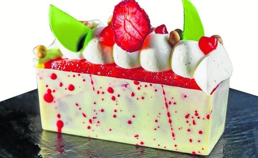 - Fundir chocolate blanco y atemperar. Llenar moldes de lingote y cuando empiece a cristalizar, vaciar. Desmoldar y salpicar con manteca de cacao y colorante rojo. Poner en la base hojaldre prensado y sobre este colocar las fresas osmotizadas. Coger hojaldre caramelizado cortado en rectangulo y presionar. Con la misma medida, cortar la Iotagar de fresas y colocarla encima. Para finalizar, montar la panacotta y dosificamos. Decorar con fresa deshidratada.