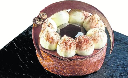 - Estirar el crujiente sobre el hojaldre horneado. Colocar el disco de bizcocho calado con café y, encima, la namelaka de café. Alisar con crema de mascarpone y cerrar con disco de chocolate atemperado. Por último, colocar la Iota de café y, alrededor, dosificar la crema de mascarpone. Decorar.