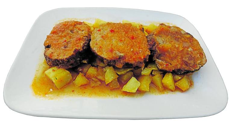 - Batimos los huevos y los echamos a la mezcla. Amasamos bien el conjunto, vamos añadiendo pan rallado y lo compactamos. Le damos forma de rollos.- Marcamos los rollos en aceite de oliva muy caliente.- Para la salsa, ponemos aceite de oliva virgen extra en una cazuela, echamos tres cebollas muy picadas y dejamos pochar muy lentamente. Añadimos pimiento rojo picado, dos vasitos de vino blanco y uno de agua y llevamos a ebullición. Salamos y trituramos. A continuación, introducimos los rollos y los dejamos hervir hasta que se hagan (20-30 minutos).- Se deben cortar en rodajas en frío. A la hora del servicio, guarnicionamos con unas patatas fritas.