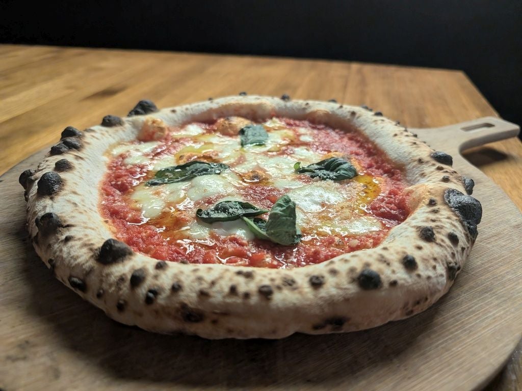 Ingredientes: Harina 00, levadura, agua, sal, tomate maduro del sur de Italia, mozzarella Fior di late, albahaca fresca, queso Galmesan 18 meses y aceite Rotalaya picual.