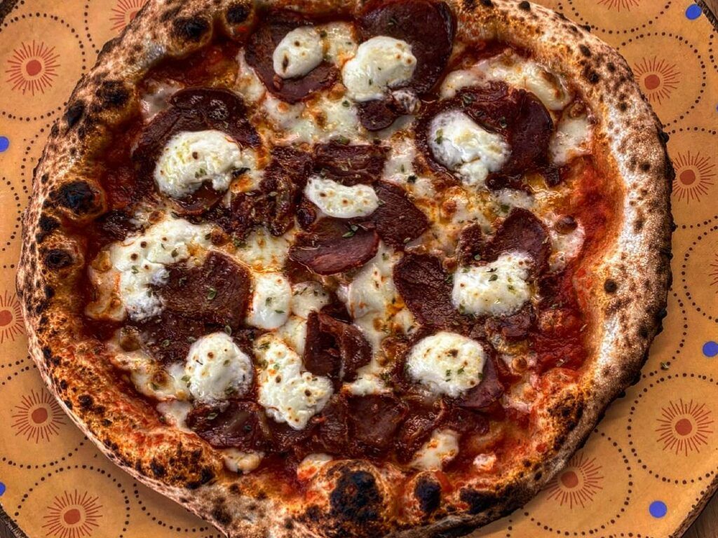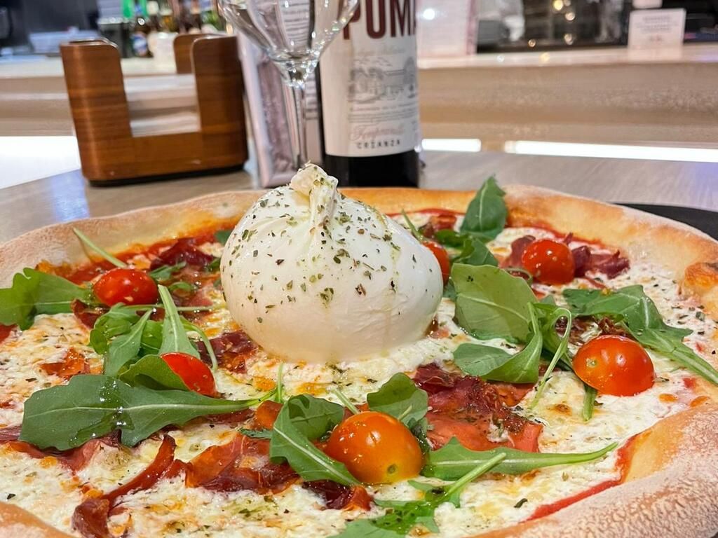 Ingredientes: Harina de trigo, agua, sal, levadura, AOVE, salsa di pomodoro, Fior di latte, rúcula, gorgonzola, speck, higo caramelizado y perlas de straciatella di bufala.
