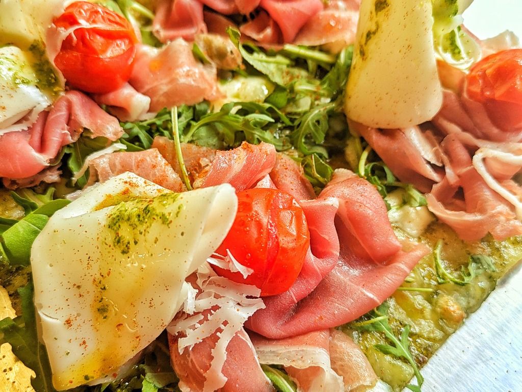 Ingredientes: Pizza romana cubierta de crema de rúcula, mozzarella Fiordilatte, tomates cherry al carbón, prosciutto crudo de Parma y láminas de provolone.