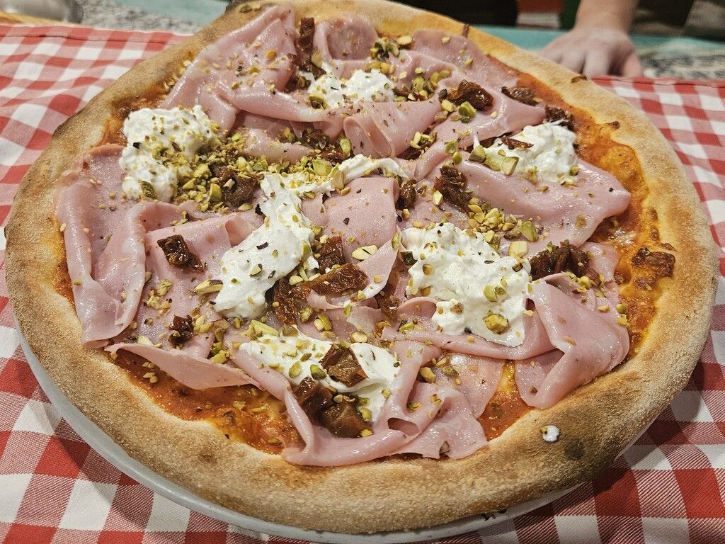 Ingredientes: Mortadela trufada, mozzarella, scamorza, tomatitos cherry, pistachos tostados y pesto.