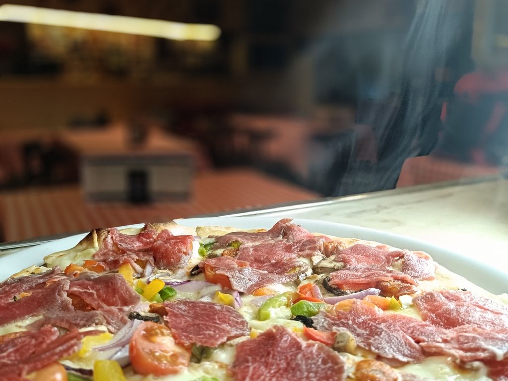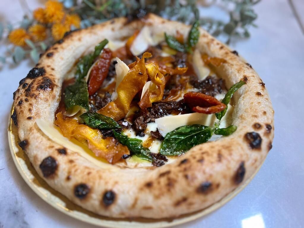 Ingredientes: Masa napolitana (harina, agua, levadura y sal), costilla de ternera angus con salsa de su demi-glace, provolone DOP, lascas de parmesano, láminas de boniato, tomates deshidratados y AOVE ahumado.