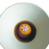 - Emplatado: Colocamos, con ayuda de un cortapastas la crema y encima apoyamos la yema de huevo y, sobre ella, el polvo de maíz seco y la flor de ajo. Bañamos con el caldo.