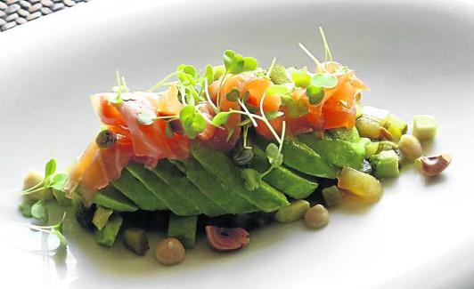 Aguacate, tartar de encurtidos, salmón ahumado y salazón