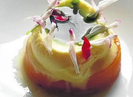 - Disponer en un plato dos aros de calabaza formando un círculo. En el centro, la crema de naranja y encima, la bola de helado de maracuyá. Aplastarla con una cuchara y echar en el centro el aceite. Decorar con pétalos de flor de tagete o caléndula.