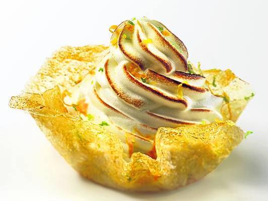 - Para las tartaletas: en un silpat (tapete de silicona) estirar 10 hojas de obulato y pintar con almíbar. Repetir esta operación 4 veces creando así 4 capas superpuestas. Hornear con calor seco a 180 grados durante 5 minutos hasta que queden doradas. Cuidado al despegar las láminas del silpat (se necesita calor para trabajarlo) y al darles forma de aro.