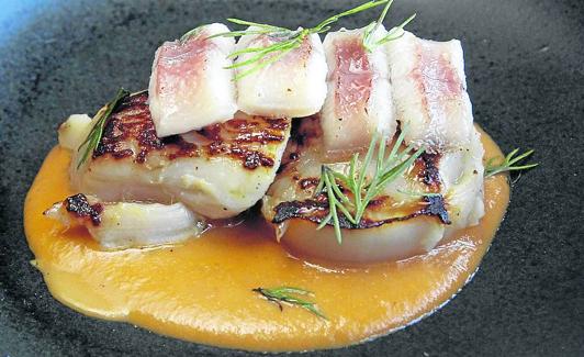 Una vieira sobre jugo de su coral y anguila ahumada es la propuesta para abrir boca del cocinero. Los dos productos principales van vuelta y vuelta en la sartén, acompañados por un jugo de coral que, además de coral lleva cebolla, tomate triturado, vino blanco y caldo de pescado.