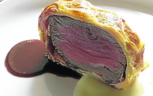 Solomillo wellington, jugo de carne y puré de patata trufado