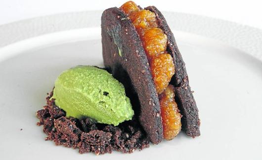 Para acabar, turrón de chocolate crujiente con almendras y helado de pistacho. La base es la galleta streusel, que lleva mantequilla, harina, azúcar, almendra y cacao en polvo, y rellenarlas de una crema de almendras.