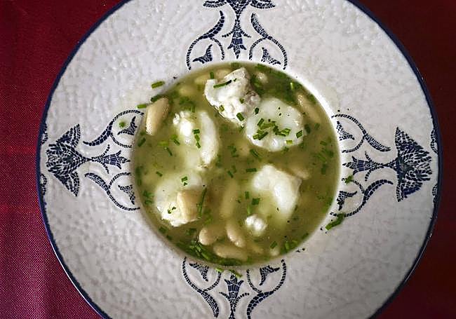 Elaboración: Estofamos las fabas con todos los ingredientes –a excepción de los que utilizaremos para las koktoxas– durante hora y media, agregando agua fría según vayan necesitando. Hacemos un pil pil con las kokotxas a fuego suave y, cuando tenga consistencia, agregamos el ajo picado muy fino. Incorporamos poco a poco el fumet hasta obtener la cantidad deseada. Añadimos a las fabas, espolvoreamos con perejil y rectificamos con sal.