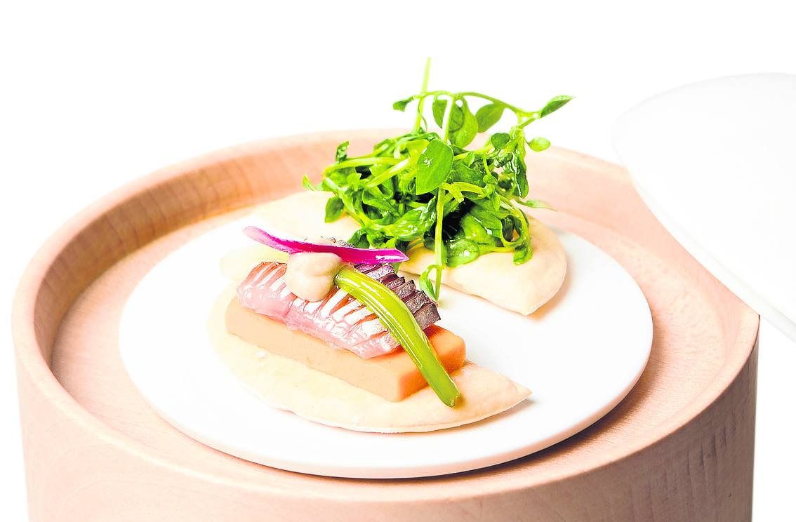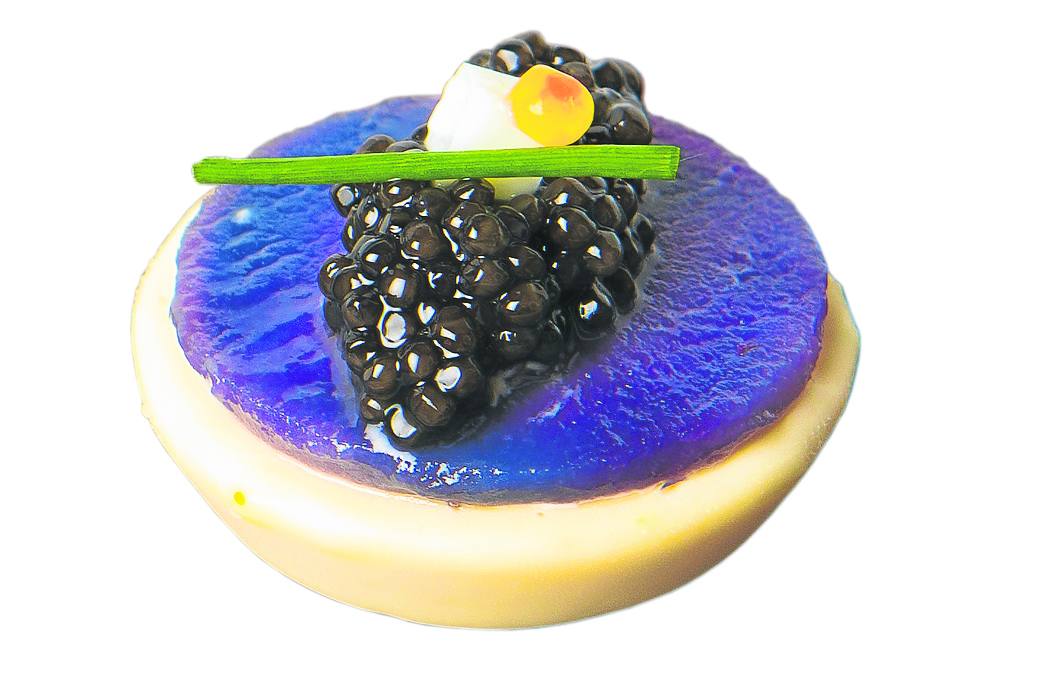 Va recubierto de manteca de cacao, una fina lámina de patata violeta y las huevas de esturión. Recomiendan sujetarlo con cuidado, ya que es un bocado delicado.