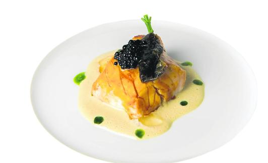 El pescado va sobre una mantequilla de algas y acompañado de esferificaciones de tinta de calamar, gelatina de caldo dashi , espagueti marino en tempura y plancton.