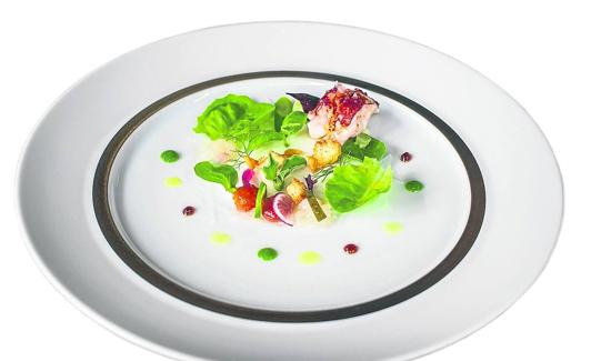 Ensalada de bogavante con anisados, su coral, brotes y guarniciones vegetales