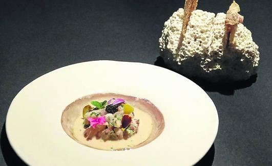 Para la elaboración del salmonete frito, matices herbales, cítricos y vegetales, es fundamental mantener las escamas del pescado, piezas de unos 200 gramos. Sus restos, o sea, espinas y cabezas, no se tiran, sino que se aprovechan para hacer un fondo de marisco muy concentrado, que Uz deja al gusto del consumidor aunque para su elaboración recomienda utilizar –él lo hace– cabezas de bogavante. El guiso lo acaba con leticitina de soja para levantarlo y lograr una especie de espuma, y un toque de paprika.