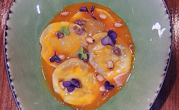 Pase: 1. Disponemos seis raviolis en cada plato. 2. Los napamos con la yema trufada. Repartimos unos puntos de brisura de trufa, piñones y brotes de micromezclum.