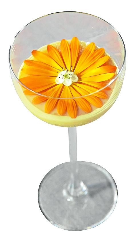 - En copa, base del tocinillo de cielo, cubrimos con kombucha y pétalos de caléndula y terminamos con la flor de endrino.