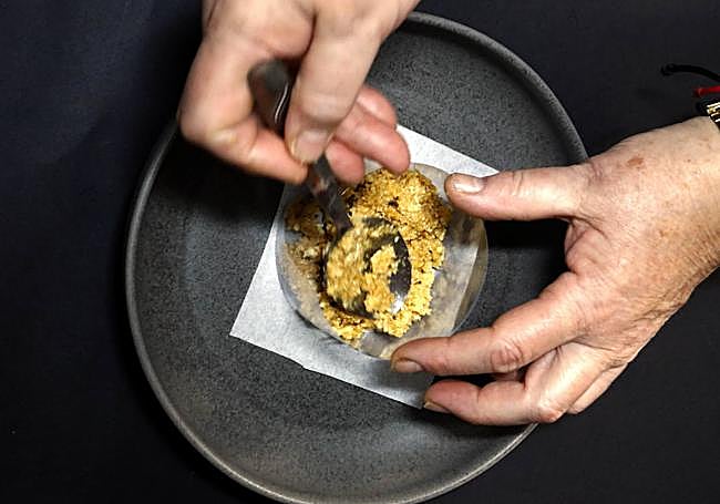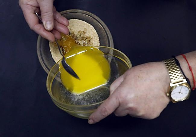 Echamos, poco a poco, la mantequilla que previamente habremos fundido en un recipiente donde está la galleta triturada y unas nueces picadas (para aportar un toque crujiente). Vamos mezclando al mismo tiempo.