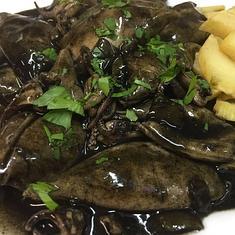 Elaboramos un fumé de pescado con las cabezas y las espinas, poniéndolo a fuego fuerte para que hierva. Mientras preparamos un fondo con las cebollas, los ajos, el pimiento verde y la guindilla, todo bien picado junto con aceite. Previamente habremos limpiado los chipirones y los habremos reservado. Cuando la verdura esté pochada añadimos una cucharadita de pimentón, un vaso de vino blanco, los chipirones y, previamente colado, el fumé de pescado. Echamos la tinta a la cacerola en cantidad suficiente hasta conseguir un color uniforme y dejamos cocer a fuego lento, rectificando de sal si fuera necesario. Antes de retirar del fuego, añadimos la medida de una taza de café llena de agua junto a una cucharada de maicena que vamos disolviendo para que el guiso coja cuerpo.Al echar maicena el guiso es apto para celíacos.En total, unos 45 minutos de cocción. Acompañamos de patatas fritas.