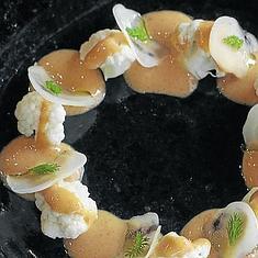 Escaldamos la coliflor hasta dejarla al dente. Con el palo cortado hacemos un caldo, al que añadimos el sirope, la citronela y unas ramas de hinojo y la lechuga de mar. Lo envasamos al vacío y dejamos 24 horas para que la coliflor se impregne. Limpiamos las huevas de oricio y las trituramos. Hacemos un jugo con un poco de agua del oricio y texturizamos con emulsionante en pasta y un poco de xantana. Colamos por el fino. Montamos con los brotes de coliflor haciendo un círculo, que salseamos con la emulsion de oricios.Decoramos con raíz de capuchina laminada en crudo y un poco de hinojo.