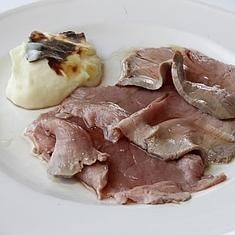 Salar el trozo de lomo media hora antes de cocinarlo, en el momento de meterlo al horno lo ponemos en una bandeja para horno y le repartimos los trozos de mantequilla por encima . Horneamos 40 minutos a 200 grados. Durante el tiempo de asado vamos preparando el puré. Cocemos las patatas con piel en agua salada hasta que se atraviesen bien con el cuchillo, las pelamos aún tibias y las pasamos por el pasapuré. A este puré hay que añadirle la mantequilla cortada en dados mientras se remueve constantemente y a fuego suave, y por último la leche muy caliente a chorro fino y sin parar de removerlo. Solo falta rectificarlo de sal y ponerlo a gratinar en un bol de horno a 200 grados durante 10-15 minutos hasta que esté dorado. Sacamos el rosbif del horno y dejamos reposar 15 minutos en un lugar templado. Después lo deshuesamos y cortamos con un cuchillo afilado. Colocamos las lonchas en una fuente templada con el hueso en el centro y bañamos con los jugos del asado.